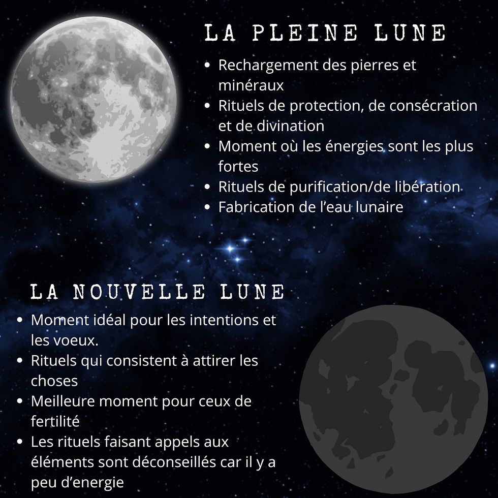 Les phases de la lune (nouvelle, croissante, pleine et décroissante) étaient directement liées aux types de rituels que les sorcières pratiquaient, en résumé (que l'on va développé tout au long de l'article) :